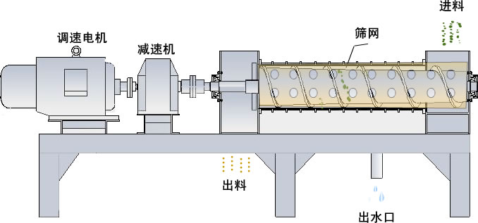 螺旋擠壓脫水機主要由進料箱、軸承座、錐型螺旋、濾水架、濾水籠、機座、聯軸器、電機、減速機及變速箱等零部件構成。其工藝原理如下:需脫水的物料以曲篩 或離心篩預脫水后,從進料口進入擠壓機(對于含水份小于85%的物料可以直接進擠壓機)。物料被錐型螺旋擠壓脫水后,送至出料口,其大部分的水份從篩板濾 出。從而達到脫水的目的。脫水后的物料可直接進干燥機進行干燥。對于物料品種的不同和產量的變化可通過調整擠壓機轉速實現,達到脫水效果和產量的好搭檔 合。調速電動機運轉正常后,物料從進料箱均勻加入,進機后的物料在螺旋旋轉葉片推動下沿軸向前進,前進過程中物料受變化的螺距和調節檔板的作用,形成巨大 的擠壓力,使物料在外力作用下進行機械脫水,水份通過篩網在出水口處排出,脫水后的物料在出料箱處排出。